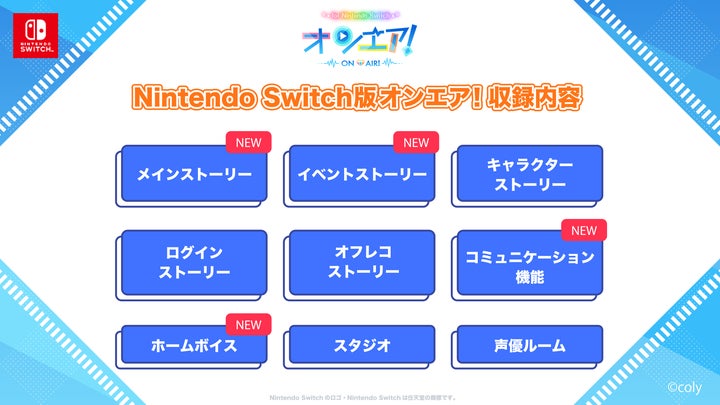 Nintendo Switch版には各種ストーリーやコミュニケーション機能、ホームボイス、スタジオ、声優ルームなどが収録されます。