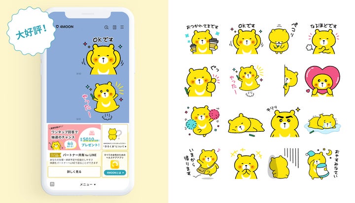 4MOONのLINEスタンプ「きろくま」は16種類展開中で、「おつかれさまです」「OKです」「ぺこり」が特に人気です。