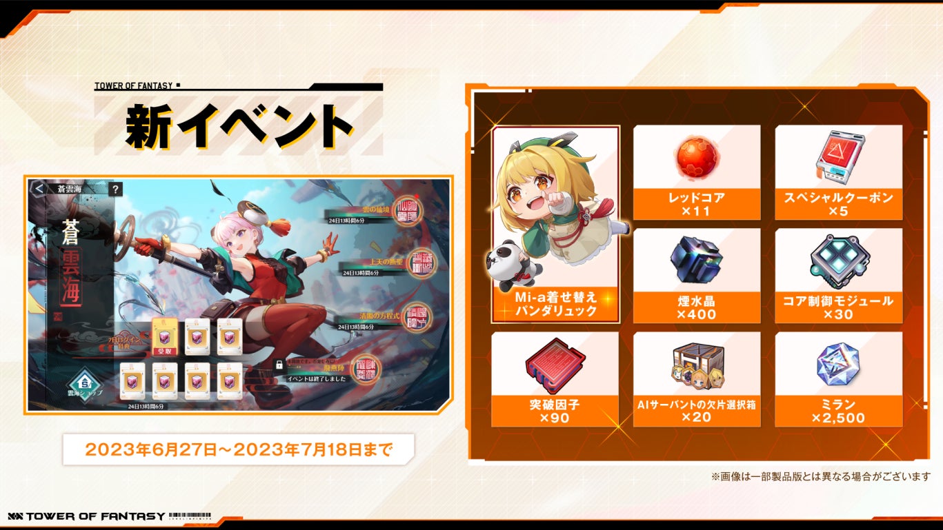 期間中、以下4種類の限定イベント「7日間ログイン」「上天の断聖」「清閣の方程式」「飛燕陣」が開催されます。参加すると「玉石」を獲得でき、雲海商店で報酬と交換できます。報酬には「レッドコア」、装備「超小型リアクター」、「外骨格」、Mi-aのコスチューム「リュック」等と交換できます。