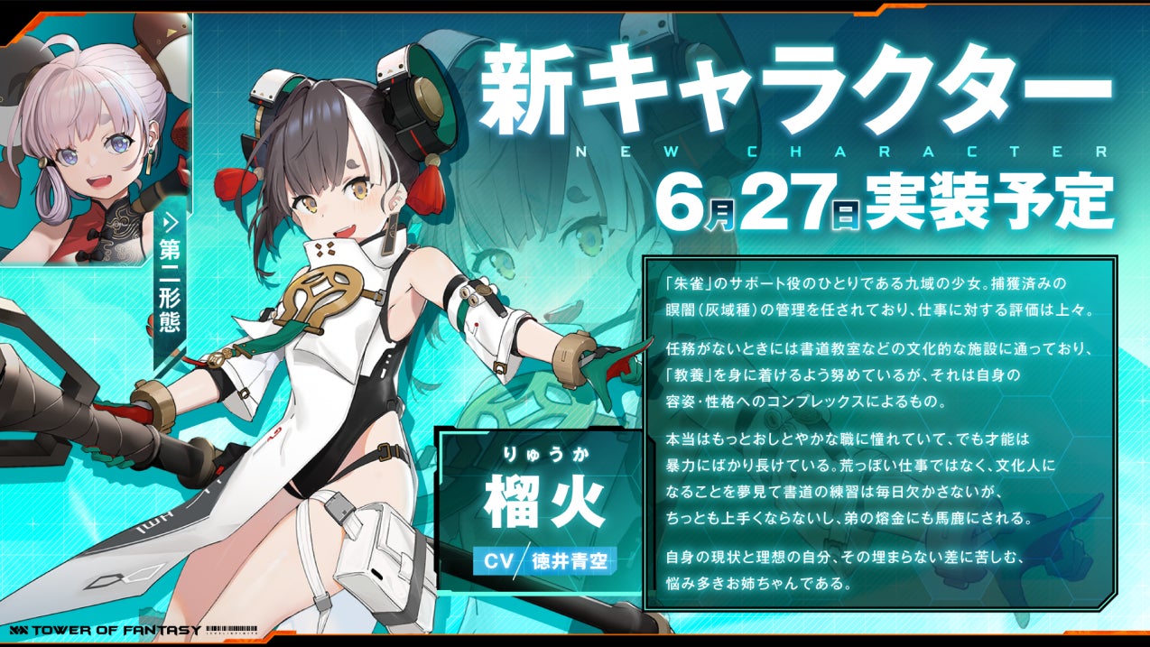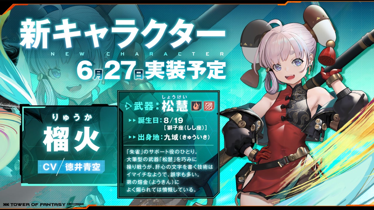 このアップデートにより、新キャラクター『榴火(リュウカ)』(CV:徳井青空)と、新規SSR武器『筆「松慧」』が登場します。さらに、『榴火』のキャラクターPVも公開されています。