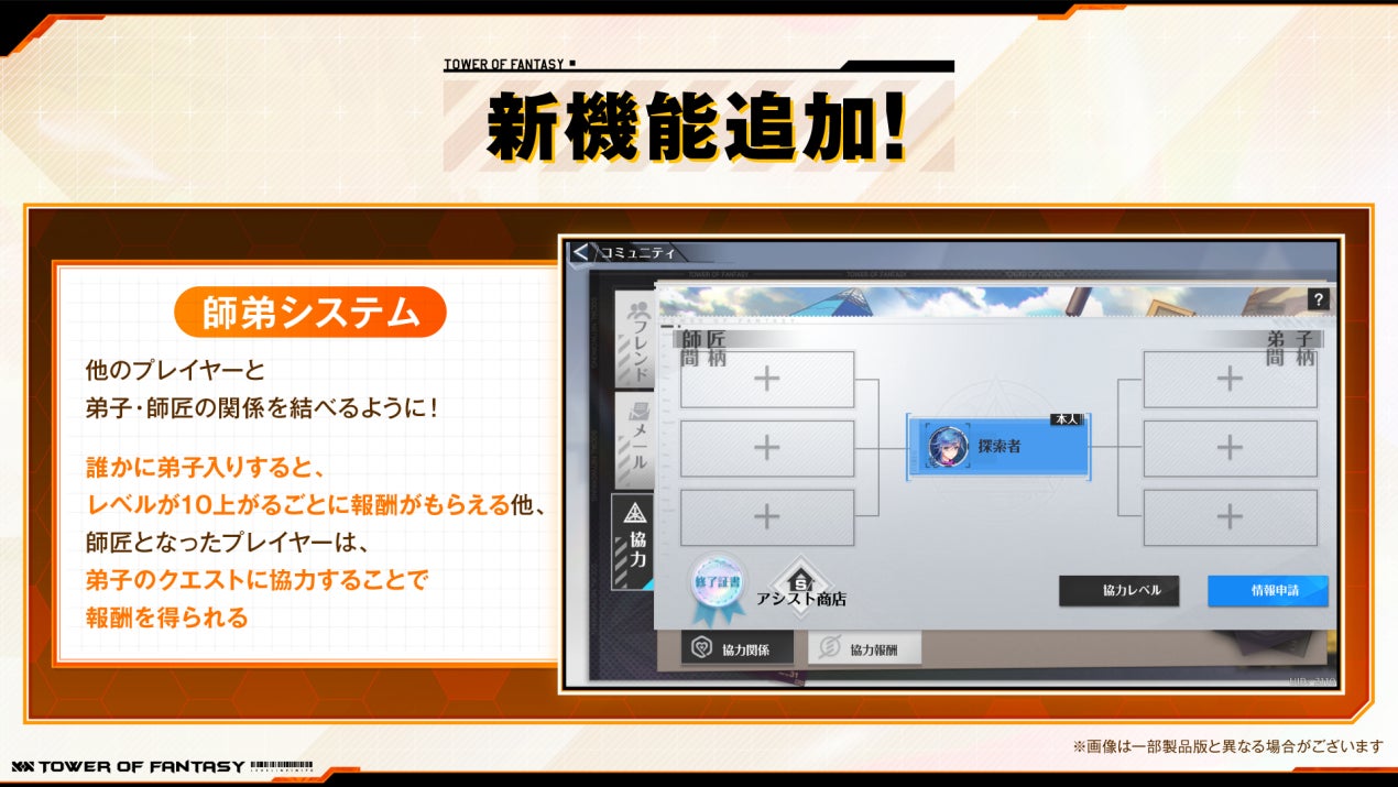 新機能として「師弟システム」が追加されます。特定の条件を満たすと、探索者同士が師弟関係を築くことが可能になります。師弟になることで、様々なミッションをクリアした際に、お互いに特典を受け取ることができます。