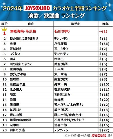 - 石川さゆりの「津軽海峡冬景色」が演歌/歌謡曲ランキング首位