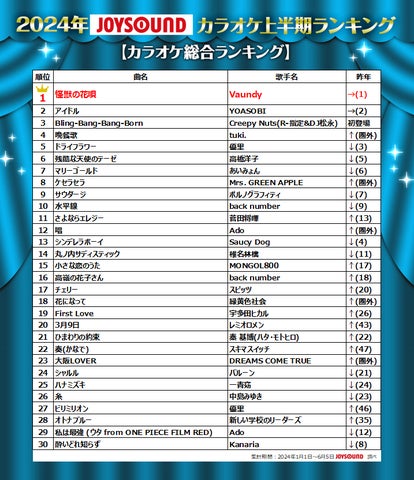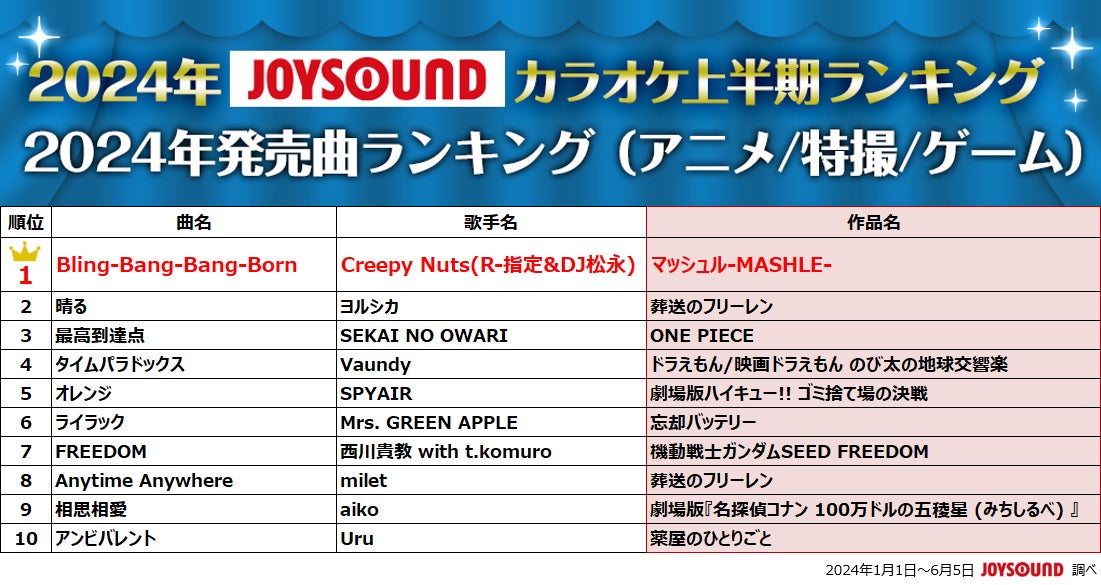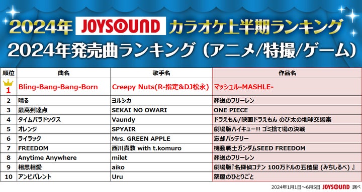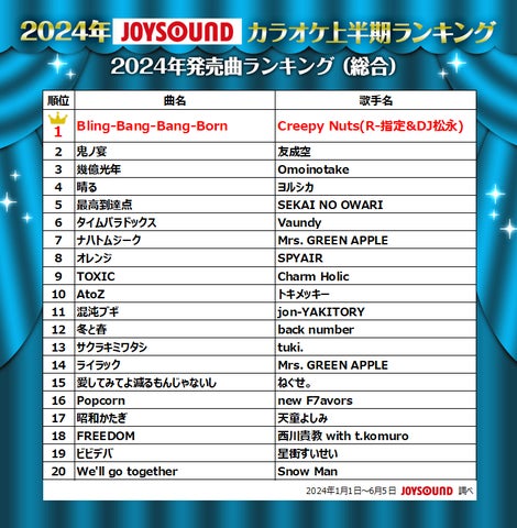 - 2024年カラオケ上半期ランキング、Bling-Bang-Bang-Born、怪獣の花唄