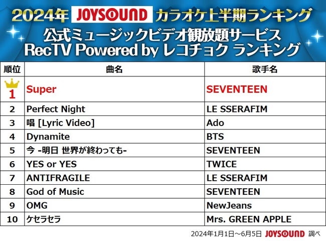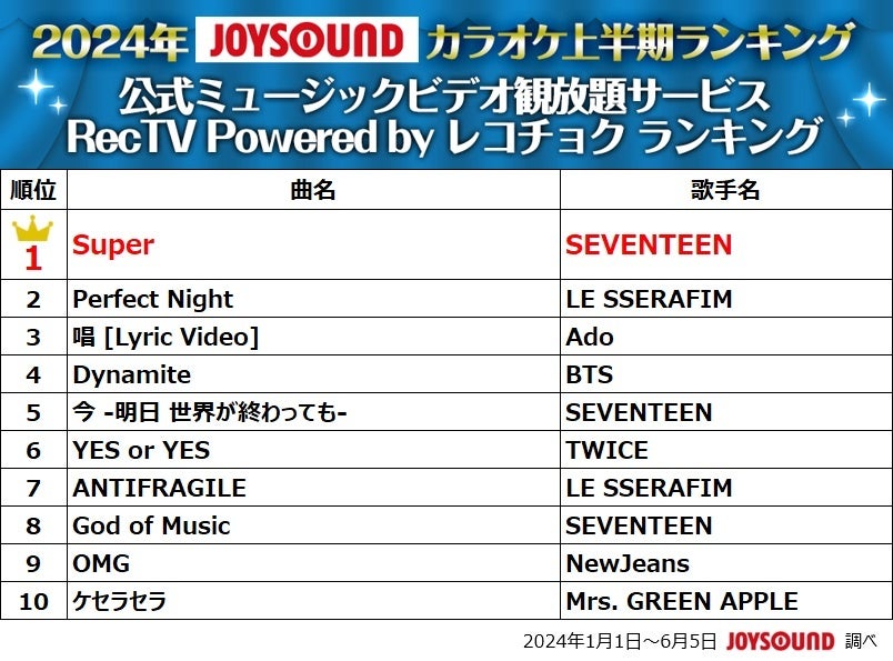 また、公式ミュージックビデオ観放題サービス「RecTV Powered by レコチョク」のランキングでは、SEVENTEEN、LE SSERAFIM、BTSなどのK-POP曲が人気を集めています。