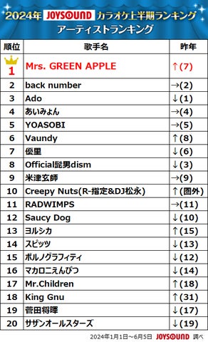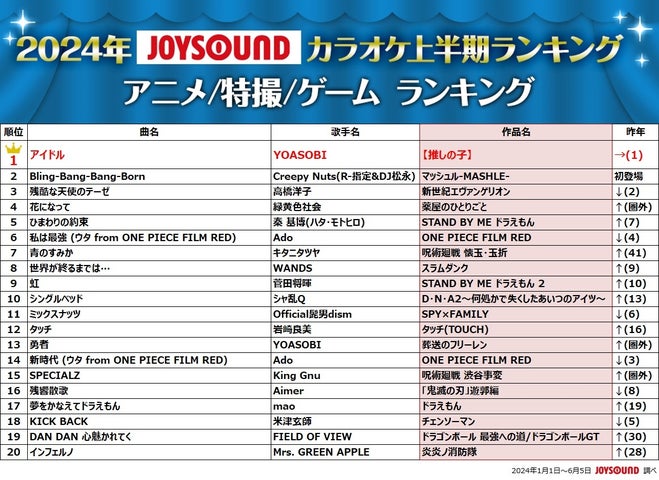 - 2024年上半期のJOYSOUNDカラオケランキング発表