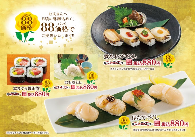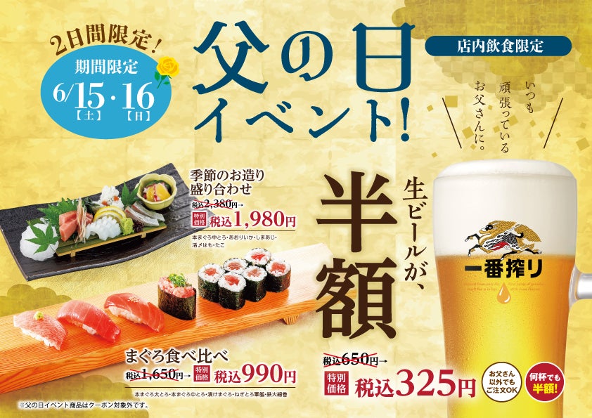 6/15、6/16は父の日イベントで生ビールが半額、特別価格のお寿司も提供されます。