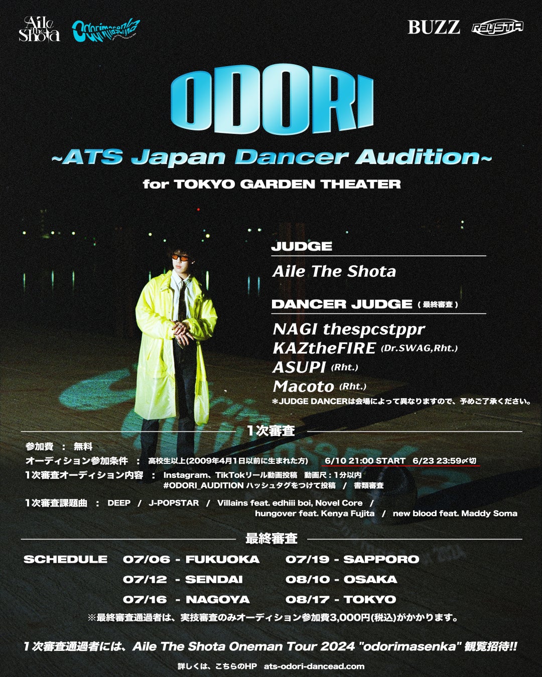 2025年3月16日に東京ガーデンシアターで開催される『Aile The Shota Oneman Live』のバックダンサーオーディションが、株式会社RaySTAとSTUDIO BUZZの協力で6都市で行われます。