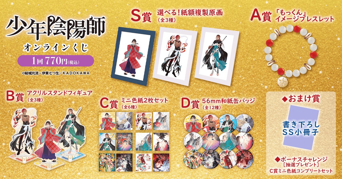 <少年陰陽師オンラインくじ 概要> 販売期間:2023年7月4日(火)12:00~2023年7月27日(木) 11:59 販売価格:1回 770円(税込)※別途発送手数料が掛かります。 |