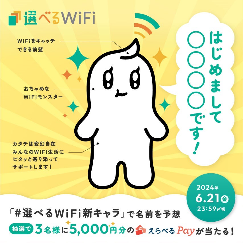 キャンペーン期間は6月21日までで、新キャラクターの名前を予想して選べるWiFiの公式アカウントをフォローし、リポストすると、えらべるPay5,000円が抽選で3名に当たります。
