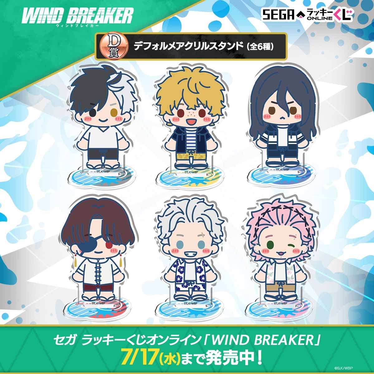 防風鈴のメンバーたちが水鉄砲で遊ぶイラストが描かれており、ビジュアルタオルやアクリルスタンドなど多彩なアイテムが当たります。