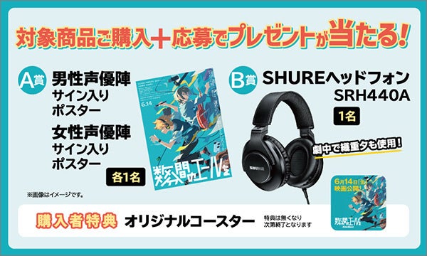 対象商品購入でオリジナルコースターをプレゼントし、抽選で男性声優陣・女性声優陣サイン入りポスターやSHUREヘッドフォンなどが当たります。