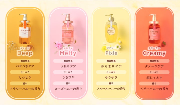 &honeyシリーズには保湿ケア、うねりケア、パサつきケア、ダメージケアに特化した4つのシリーズがあります。