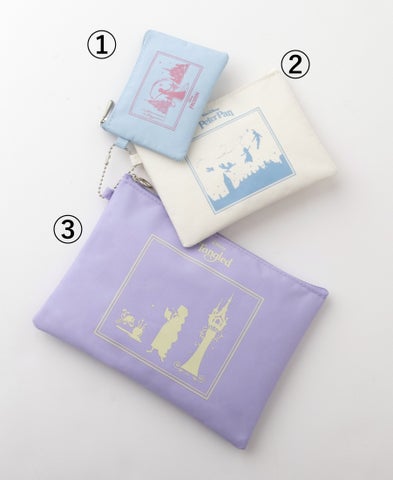 限定アイテムとして、ラプンツェル、エルサ、ピーター・パンをデザインした3種のポーチが登場します。