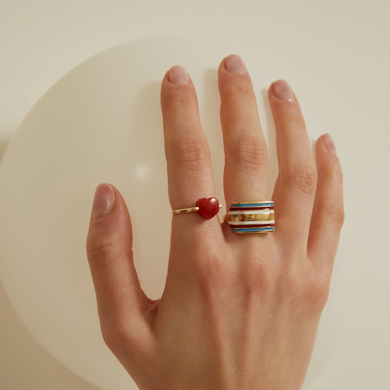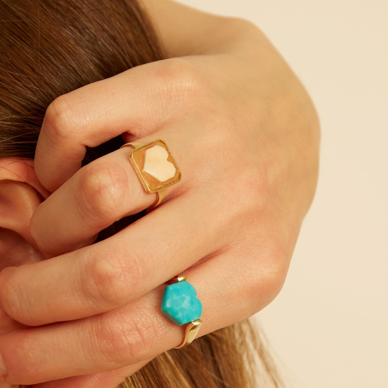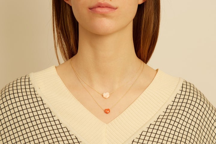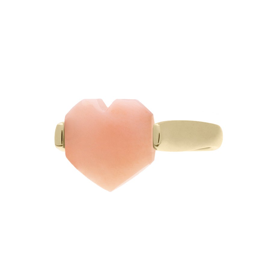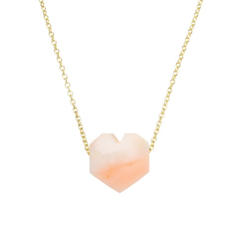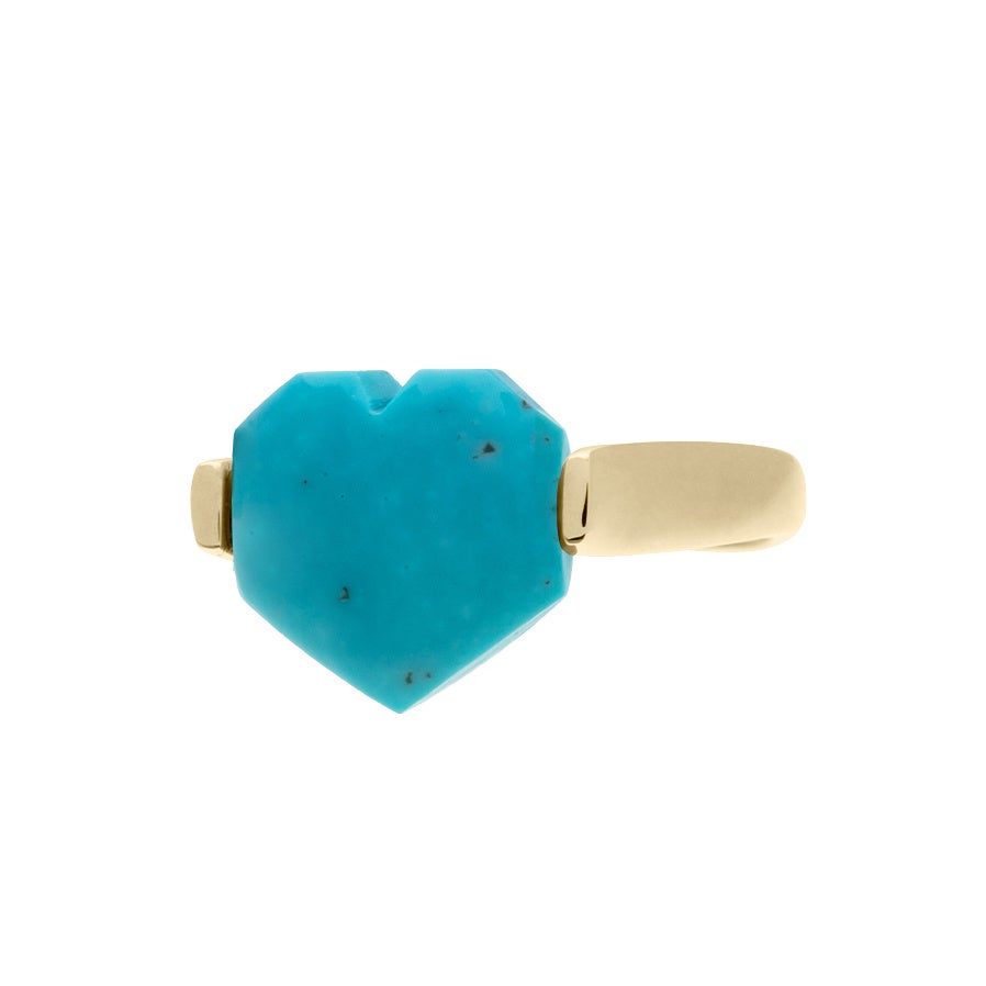 ピンクのコーラルやブルーのターコイズを使用し、9Kゴールドと組み合わせ、イタリアの職人により手彫りされた6角形のハートが魅力的です。