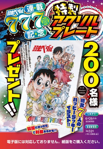 さらに、「弱虫ペダル」777回記念のアクリルプレート200名分や、「浦安鉄筋家族」300回記念の限定Tシャツ15名分のプレゼントもあります。
