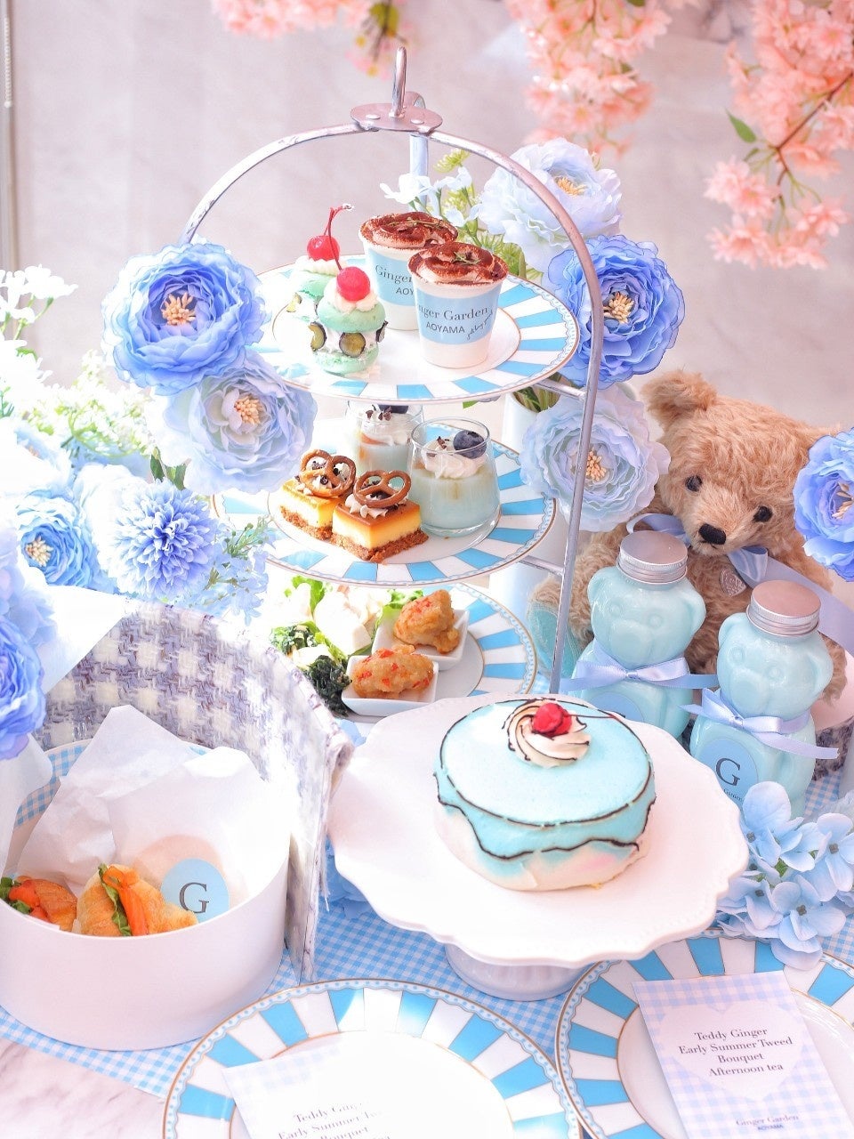 韓国風の「Teddy Ginger Early Summer Tweed Bouquet Afternoon tea」では、韓国風のスイーツやセイボリーが楽しめるほか、フルーツたっぷりの2Dケーキも登場する。