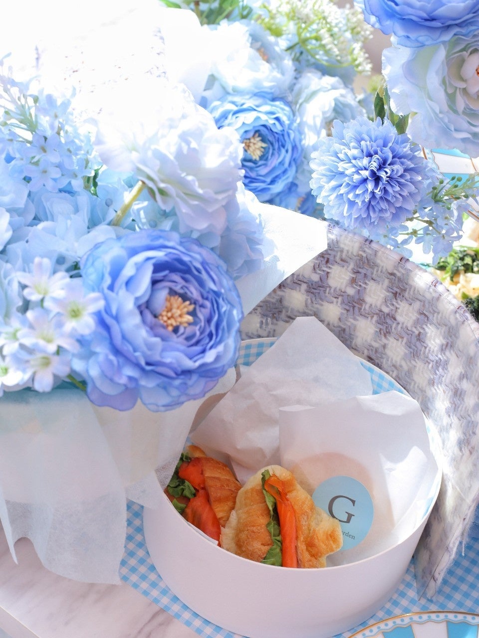 ツイードブーケ風のフラワーボックスにもプルコギバーガーやスモークサーモンのクロワッサンサンド