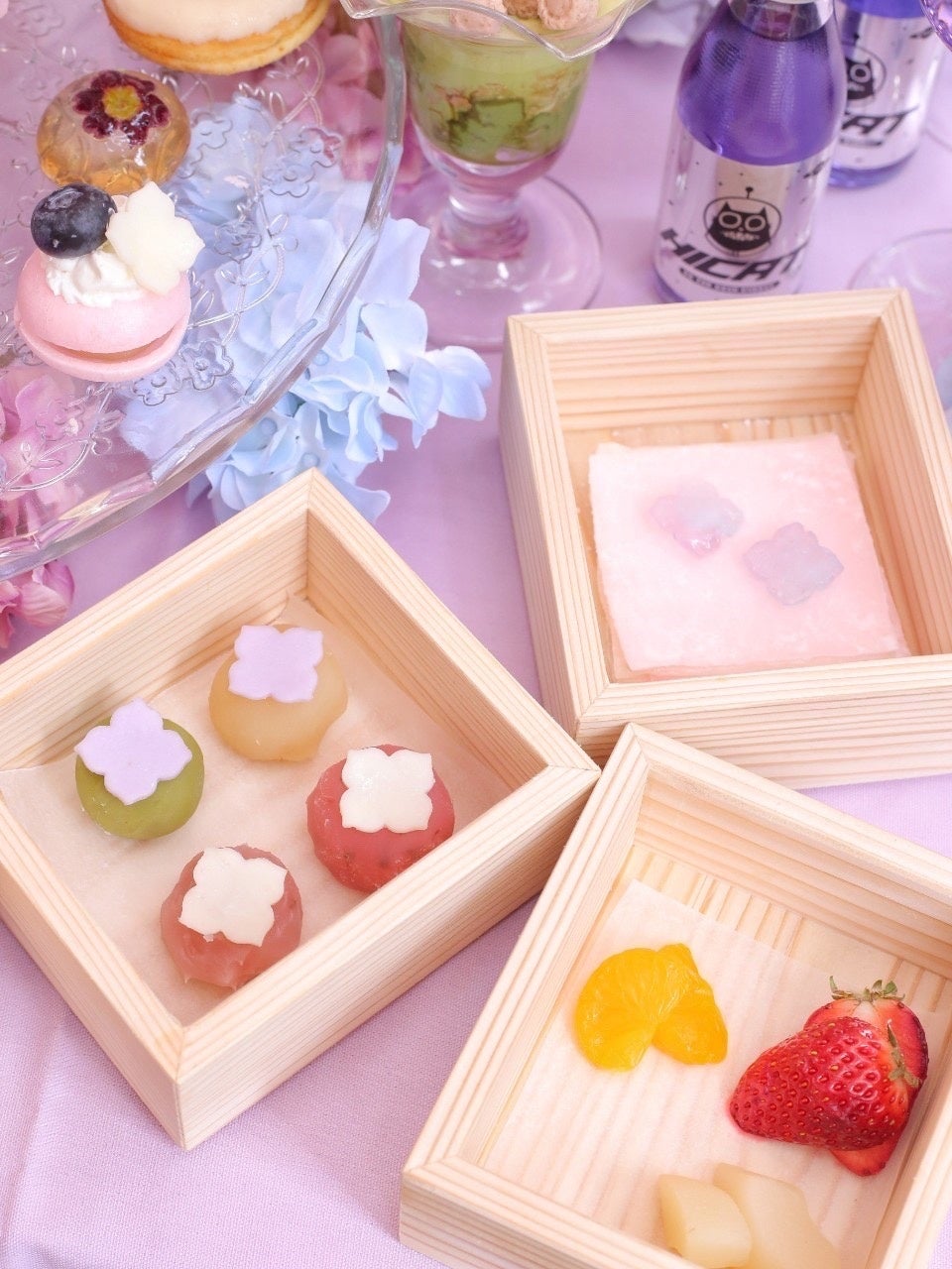 - 和風の「てでぃじんじゃーくんの紫陽花 和ふたぬーんてぃー」では、季節のフルーツ大福や和のスイーツ、セイボリーが楽しめる
