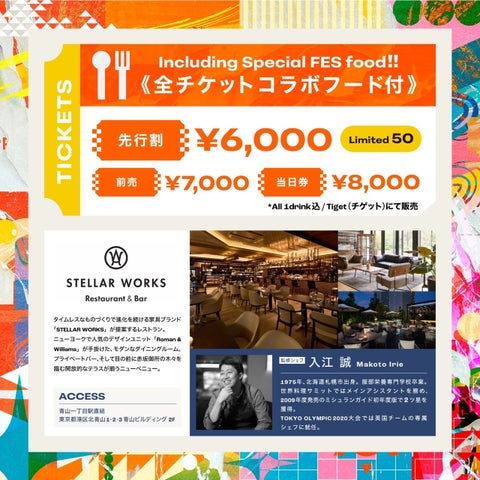会場は青山1丁目にある「STELLAR WORKS Restaurant & Bar」で、特別チケットではミシュラン二ツ星シェフによるFES foodを楽しめます。