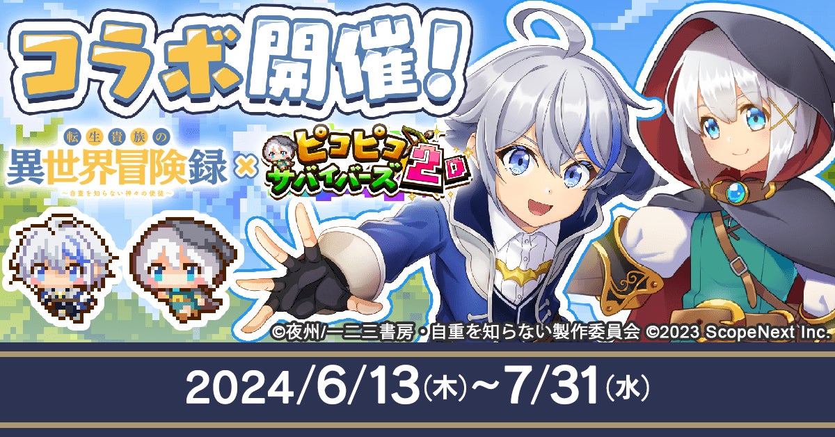 『ピコピコサバイバーズ2D』と大人気アニメ『転生貴族の異世界冒険録〜自重を知らない神々の使徒〜』のコラボイベントが、2024年6月13日(木)メンテナンス後から7月31日(水)23:59まで開催されます。