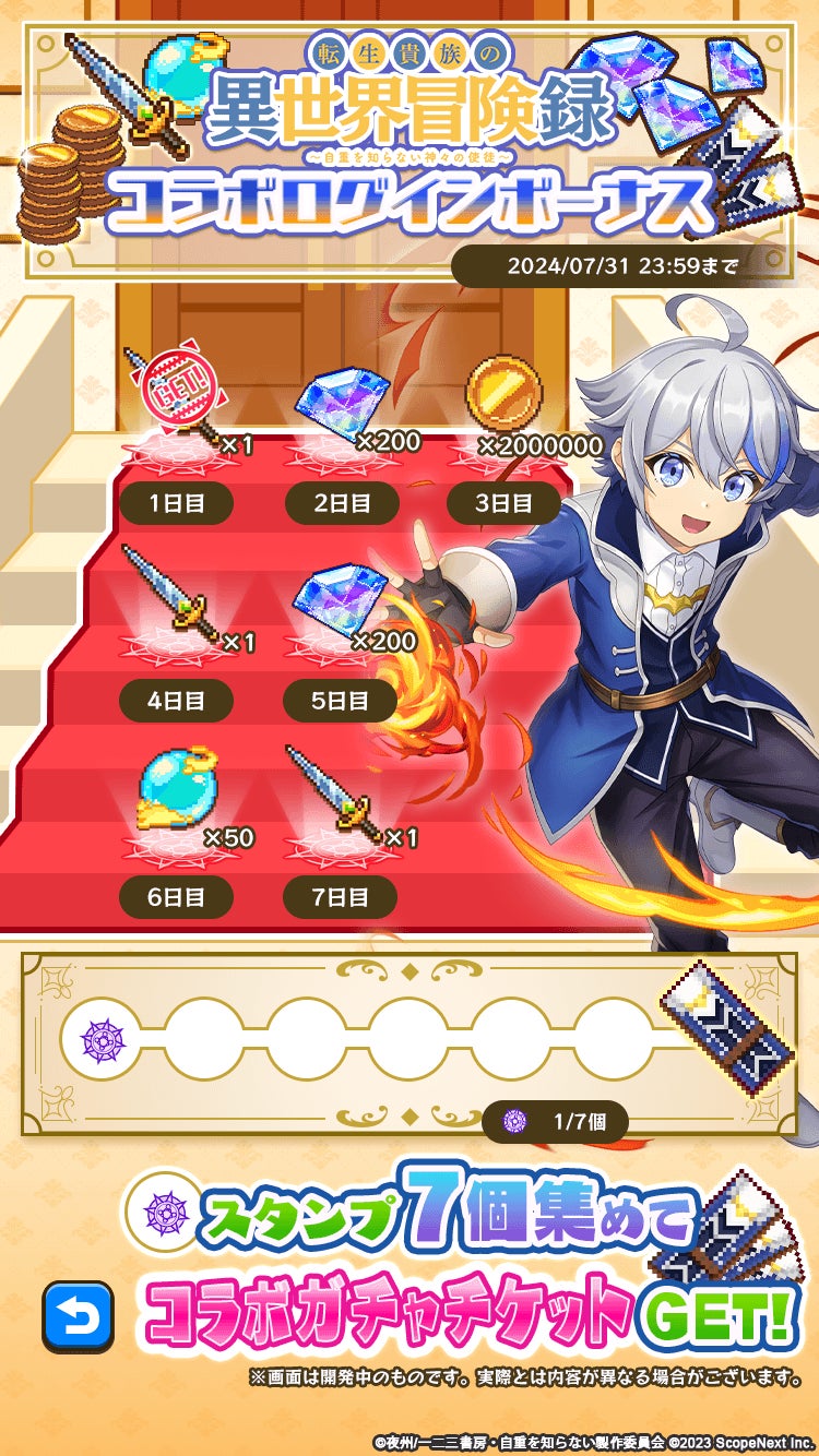 イベント期間中は、ログインボーナスで毎日1個スタンプを獲得でき、7日間ログインするとコラボガチャが回せる「コラボガチャチケット」が最大10枚手に入ります。