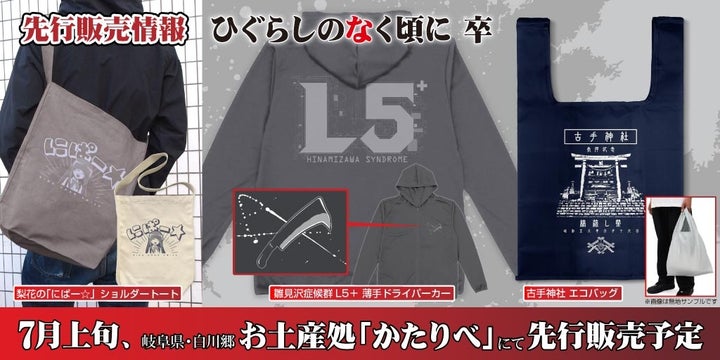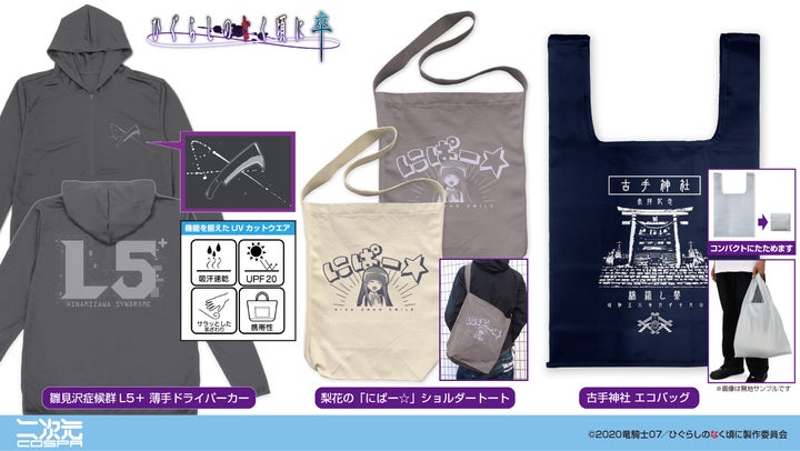 - 古手梨花デザインの「にぱー☆」ショルダートートや雛見沢症候群L5+薄手ドライパーカー、古手神社エコバッグ登場