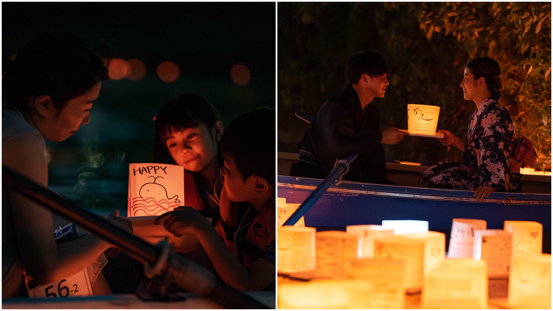 プランには「船上贈り灯」の確約が含まれ、手書きメッセージ灯ろうを船上から流す特典も付いています。