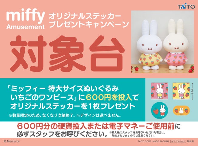 6月第4週に登場する「ミッフィー 特大サイズぬいぐるみ いちごのワンピース」には、600円でオリジナルステッカー1枚がプレゼントされます。