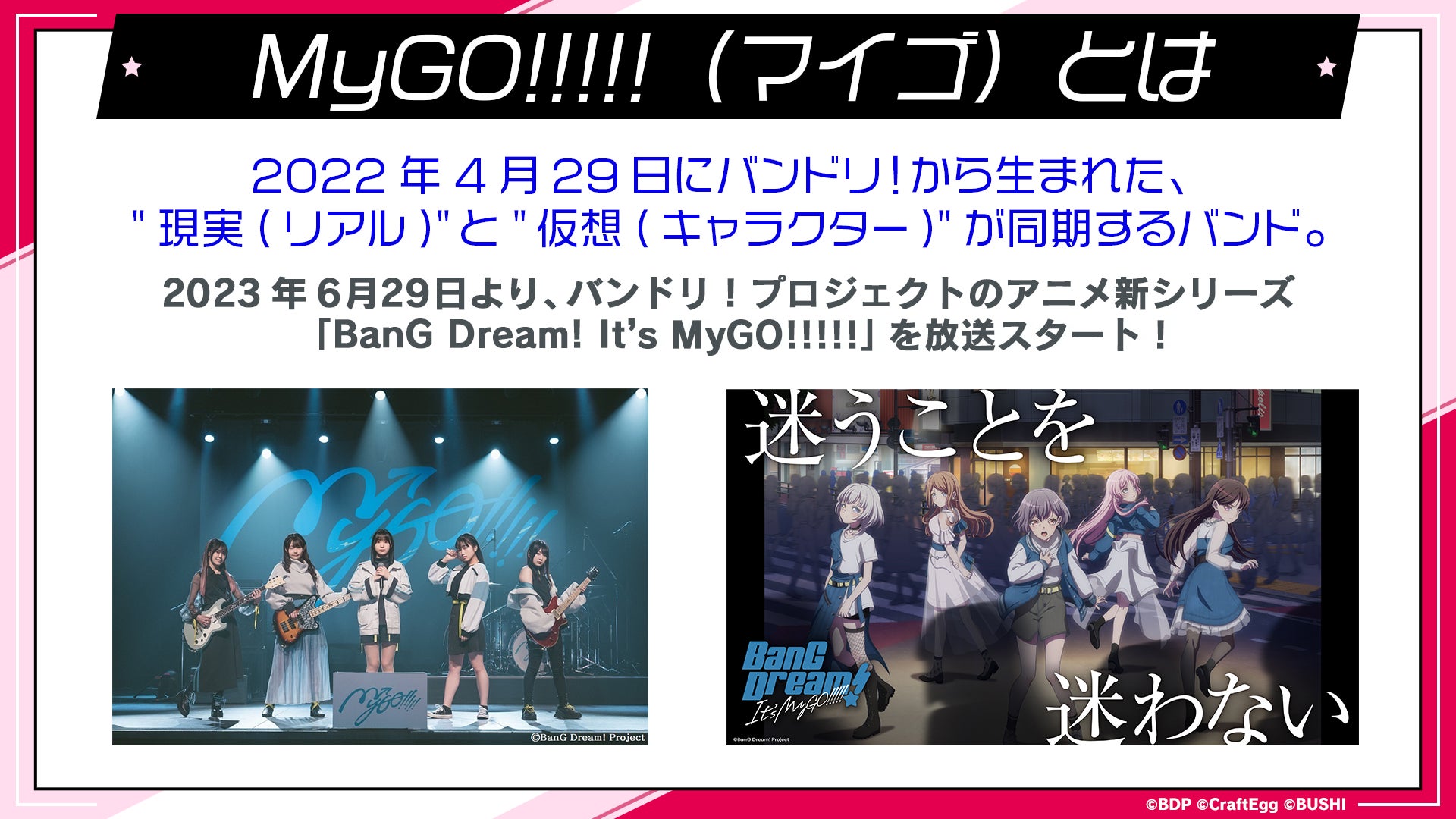 2022年4月29日にバンドリ!から生まれた、”現実(リアル)”と”仮想(キャラクター)”が同期するバンド。2023年6月29日(木)より、バンドリ!プロジェクトのアニメ新シリーズとしてアニメ「BanG Dream! It’s MyGO!!!!!」を放送いたします。MyGO!!!!!の詳細につきましては、特設サイトをご確認ください。