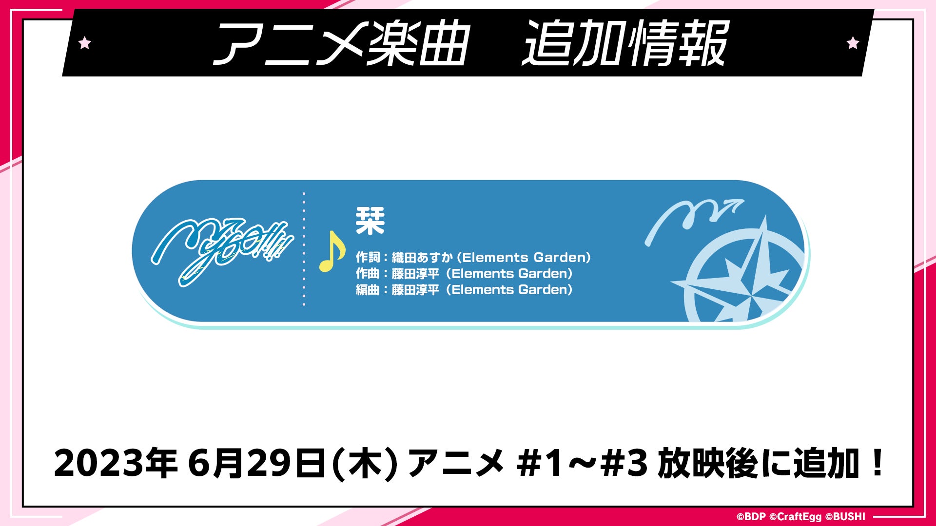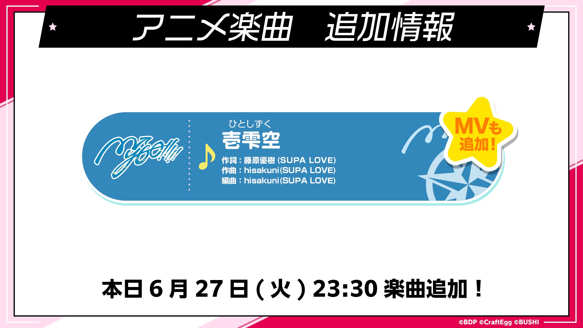 2023年6月27日(火)より、アニメ「BanG Dream! It’s MyGO!!!!!」オープニングテーマ『壱雫空』と、『壱雫空』の楽曲MVをゲーム内に追加いたしました。また2023年6月29日(木)のアニメ「BanG Dream! It’s MyGO!!!!!」放送終了後に、エンディングテーマ『栞』をゲーム内に追加することが決定いたしました。