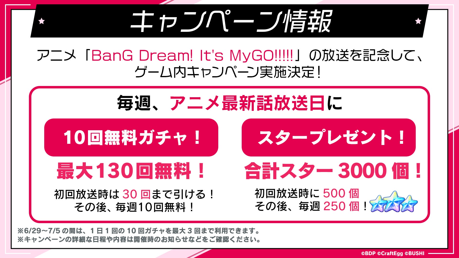 アニメ「BanG Dream! It’s MyGO!!!!!」の放送を記念したゲーム内キャンペーンの実施が決定いたしました。アニメ放送期間中、最大で130回分が無料で引けるガチャや、合計「スター3000個」をプレゼントするログインキャンペーンを実施いたします。