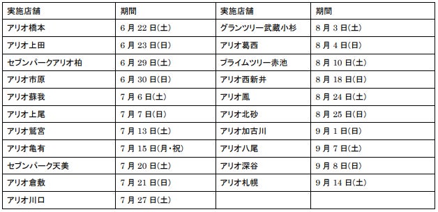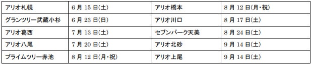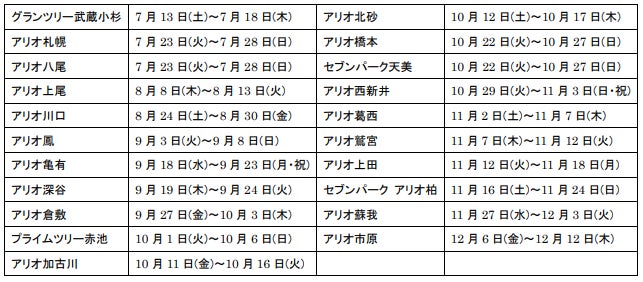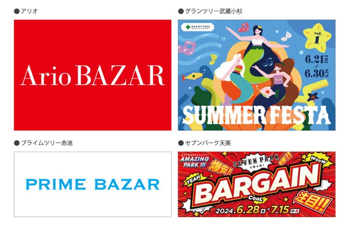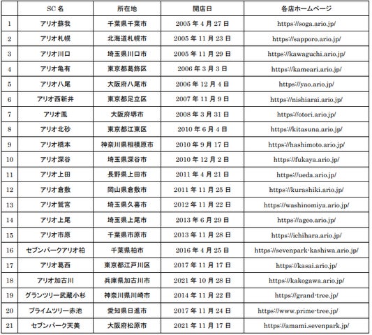 - アリオ、グランツリー武蔵小杉、プライムツリー赤池、セブンパーク天美