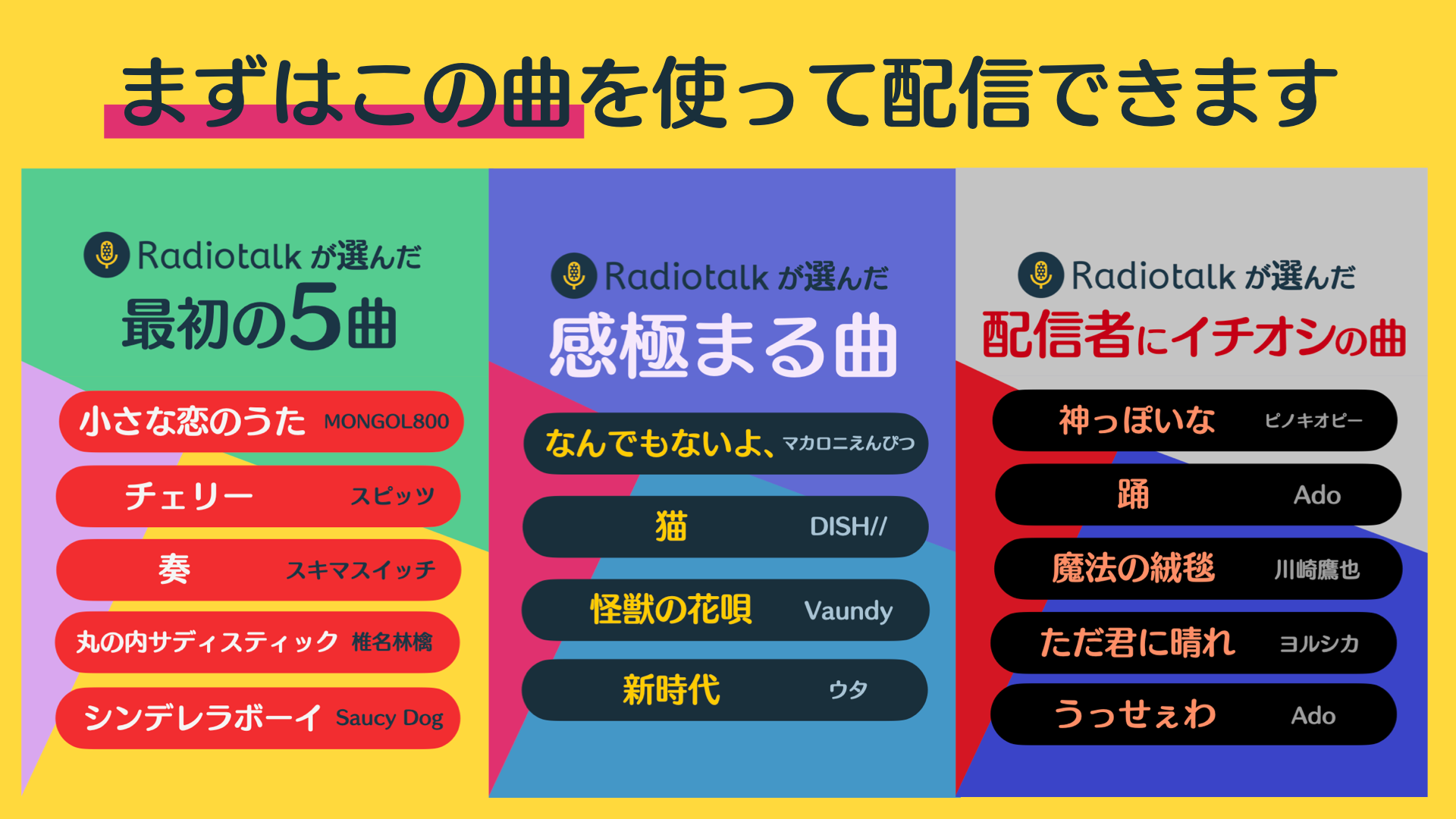 「Radiotalk」では、スマホひとつで「小さな恋のうた」「チェリー」「神っぽいな」「シンデレラボーイ」などの人気楽曲のインストロメンタルを流しながら、歌やトークを配信できる仕組みをβ版で提供開始いたします。人気楽曲は、JOYSOUNDを展開するエクシングのカラオケ音源を活用し、β版では一部の楽曲をご利用いただけ