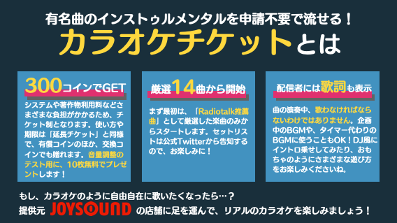 また、新機能「カラオケチケット」を提供し、リスナーから贈られたチケットで歌を楽しめる。