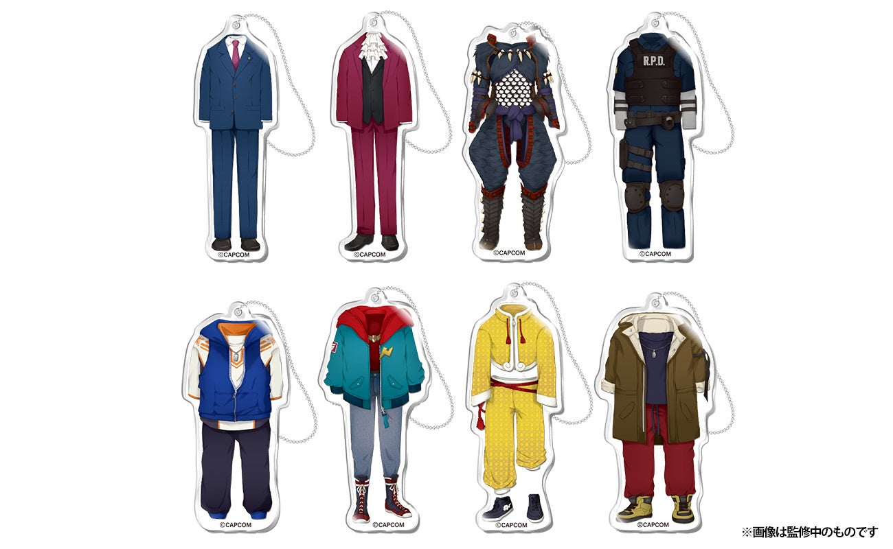 さらに、「ストリートファイター6」のキャラクターたちのアクリルスタンドや、カプコンキャラクターの衣装をモチーフにしたアクリルキーホルダーも登場します。