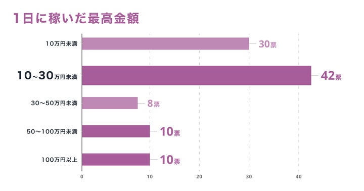 patoキャストユーザー向けの調査によると、1日に稼いだ最高金額は「10万円以上30万円未満」が42%で最も多かった。