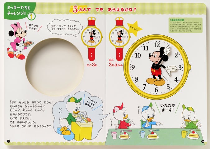 また、「ミッキーたちとチャレンジ!」のページでは実生活にリンクした「分」の概念に触れ、ゲーム感覚で楽しみながら学べます。