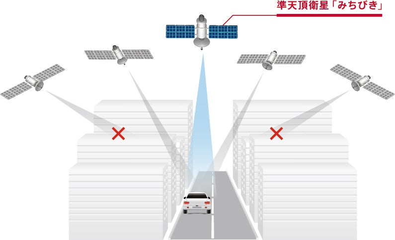 「みちびき」は日本のほぼ真上を通過する衛星のため、高層ビル街や山間部などGPSが受信しにくい場所でも受信でき、測位精度の向上に効果を発揮します。