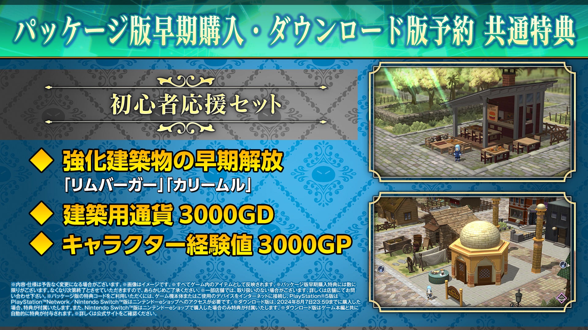 「初心者応援セット」には、強化建築物の早期解放「リムバーガー」「カリームル」、建築用通貨3000GD、キャラクター経験値3000GPが含まれます。