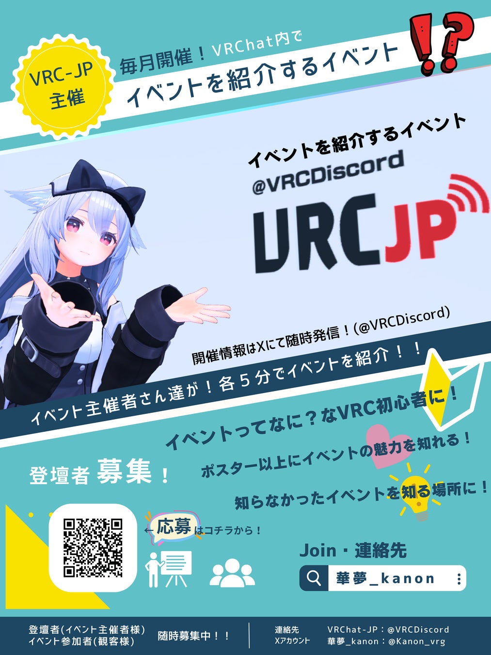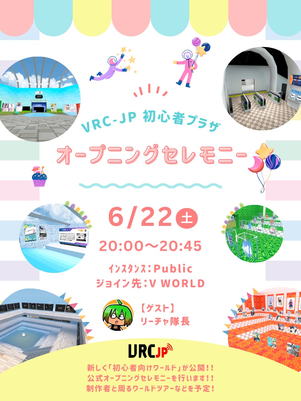- VRC-JP 初心者プラザ、イベントを紹介するイベント、VRC-JP 初心者プラザオープニングセレモニー、VRC-JP、V WORLD、ウルフェリア、桔梗、iwaSync3、Sliden、エリアマイク、ポンデロニウム研究所、Discordサーバー『VRC-JP』、公式X、ANREALAGE、大丸松坂屋百貨店、Roblox
