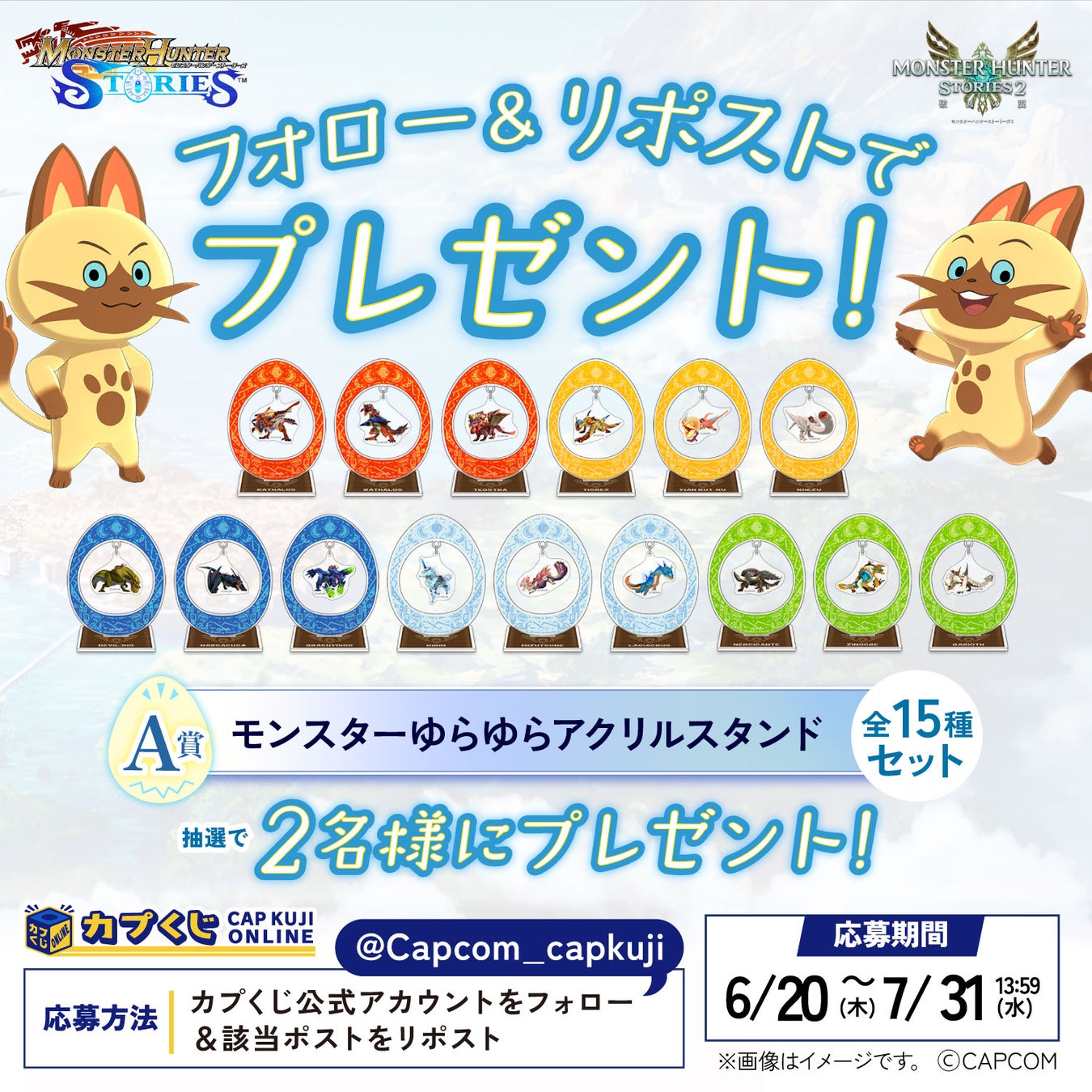 さらに、カプくじオンラインの公式X(旧Twitter)アカウントでは、フォロー&リポストキャンペーンも開催!抽選で2名様に「A賞:モンスターゆらゆらアクリルスタンド」全15種セットが当たります。