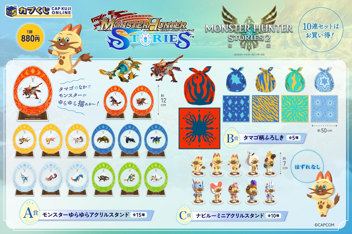 モンスターと絆を育むRPG「モンスターハンター ストーリーズ」シリーズのグッズが、カプコンのオンラインくじサービス「カプくじオンライン」に登場です。