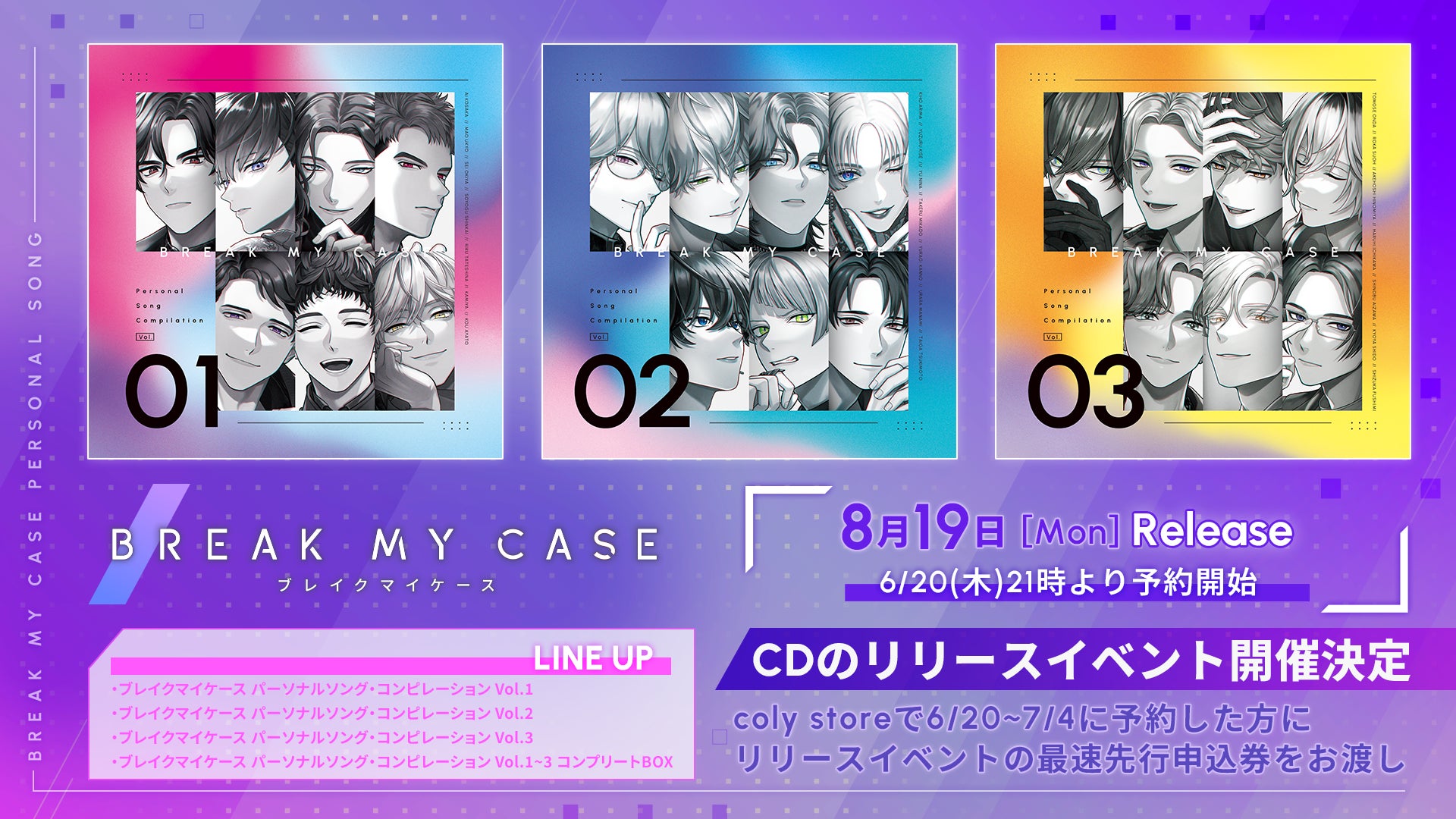 CDには、各キャストのコメント音源も収録され、3枚組のコンプリートBOXには、12月7日開催のキャストイベント「ブレイクマイケース-Kick Off Conference-」の最速先行抽選券も封入されます。