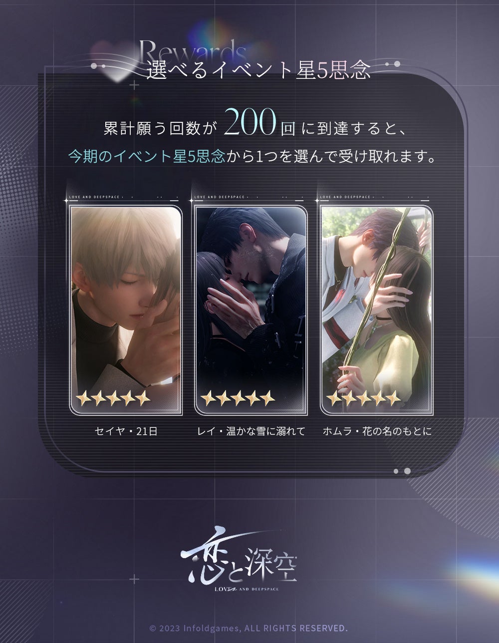 深空願い券・限定×15、イベント思念衣装、当期イベント限定星5思念、深空願い券・限定×10、ダイヤ×500、操作可能限定秘蔵品、限定称号、撮影用シール、アイコン
