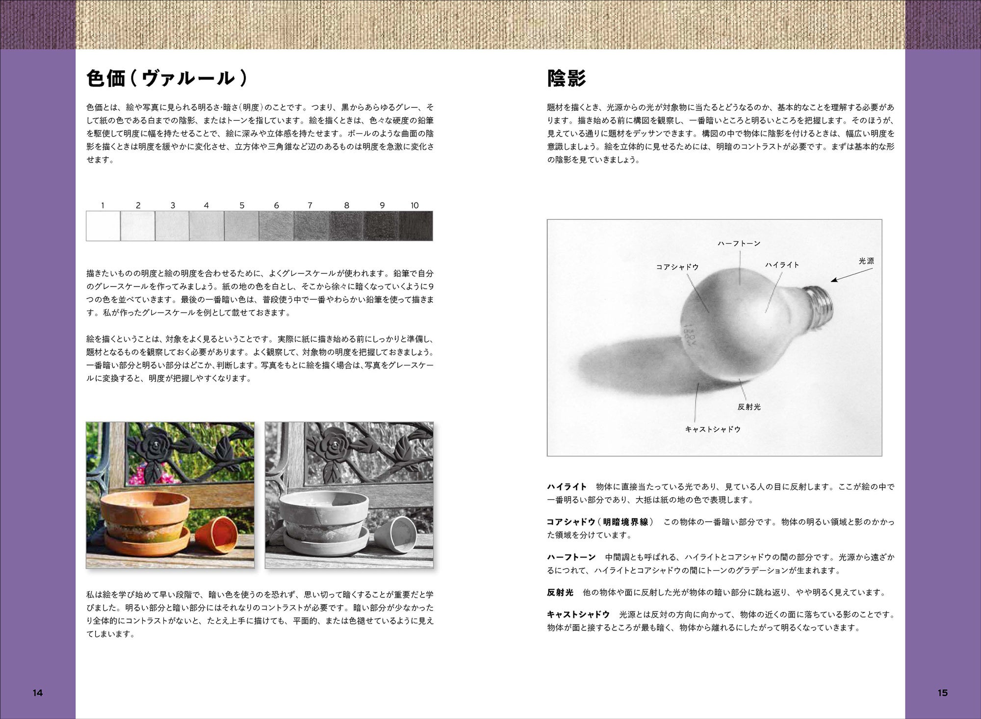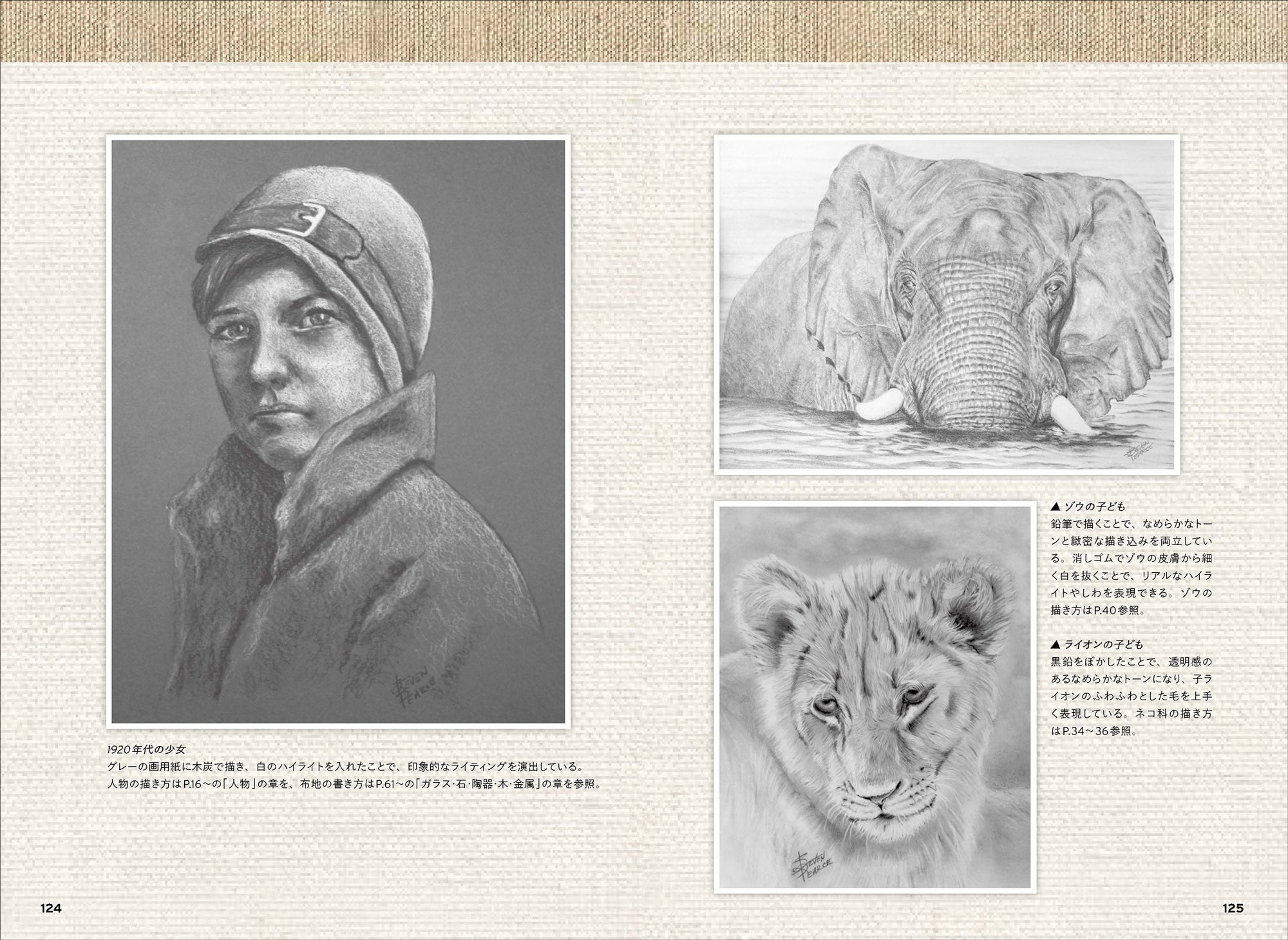 鉛筆や木炭でさまざまな質感を表現する方法や、基本的なテクニックも解説されています。