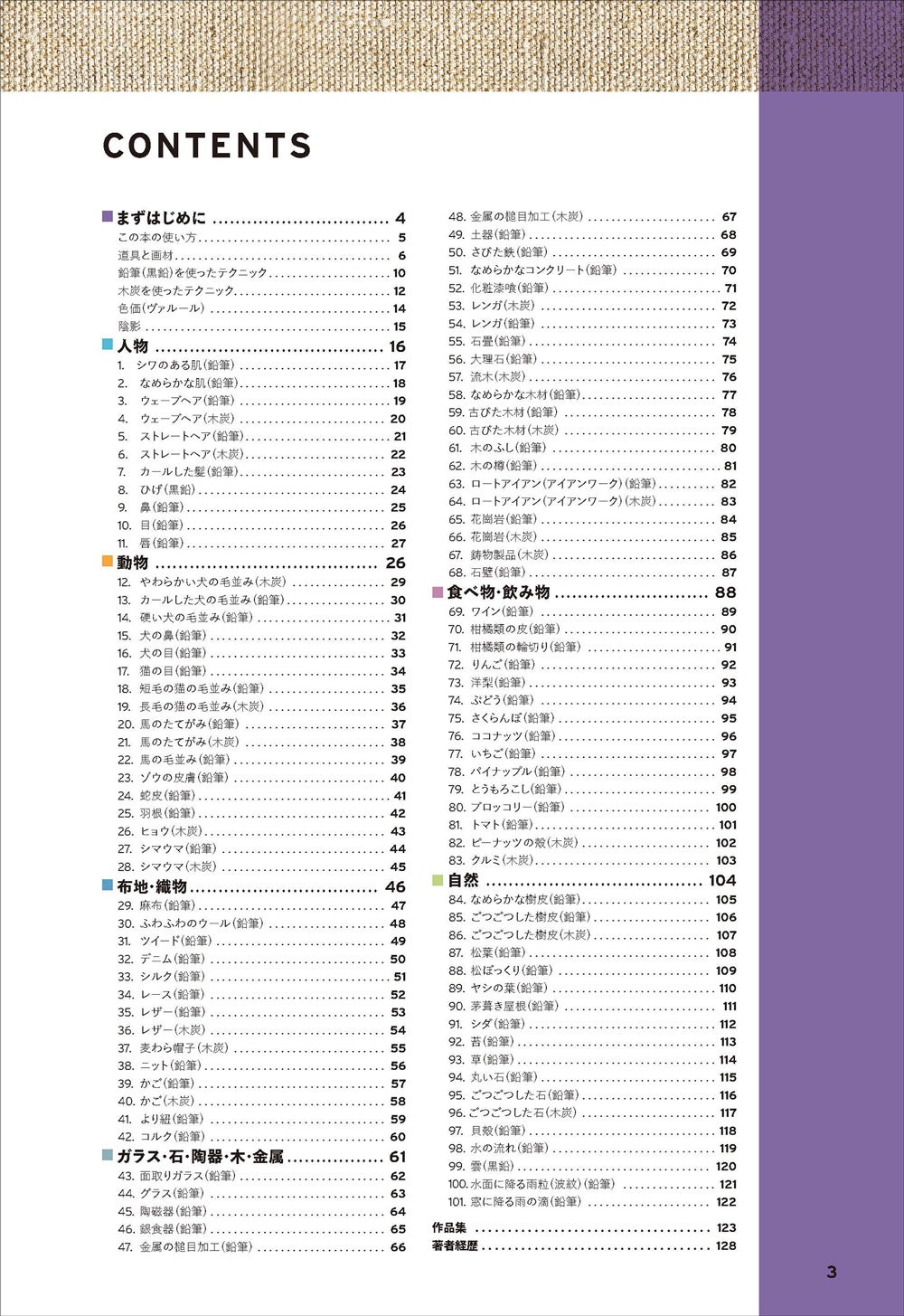 - 鉛筆や木炭でさまざまな質感を表現する方法や、基本的なテクニックも解説されており、著者の作品集も収録されています。