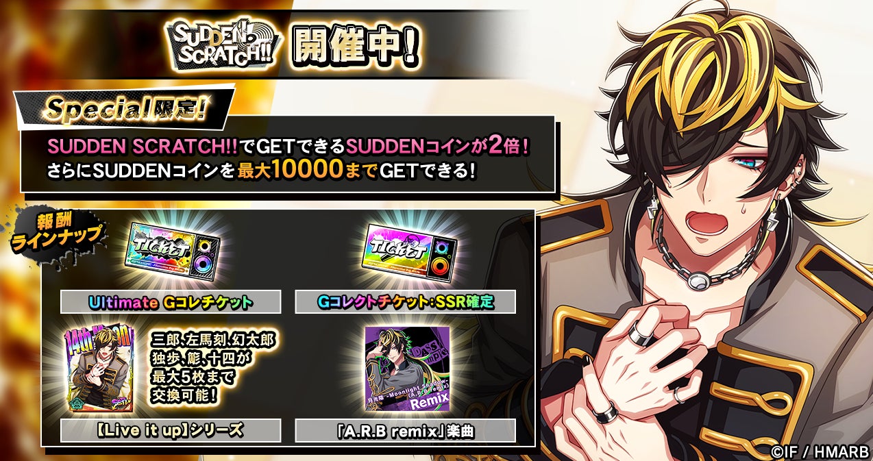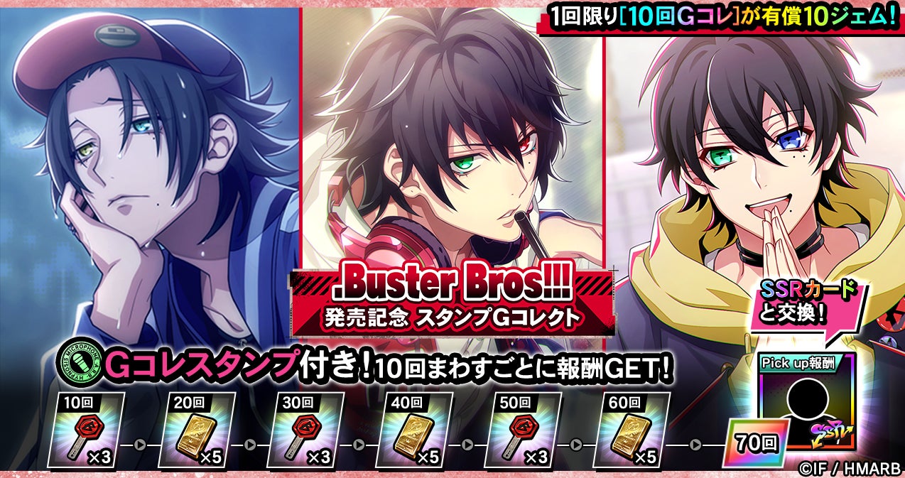 - SSR【萬屋ヤマダは夏季休暇】山田一郎、SSR【泳げる次男坊】山田二郎、SSR【水禍のそなえ】山田三郎、SSR【Greenery】飴村乱数、SSR【Greenery】夢野幻太郎、SSR【Greenery】有栖川帝統、SSR【バースデー2024】毒島メイソン理鶯、SSR【バースデー2024】伊弉冉一二三、Ultimate Gコレチケット、SUDDENコイン、Ultimate Gコレチケット、A.R.B remix、.Buster Bros!!!、Gコレクトチケット、ブースター