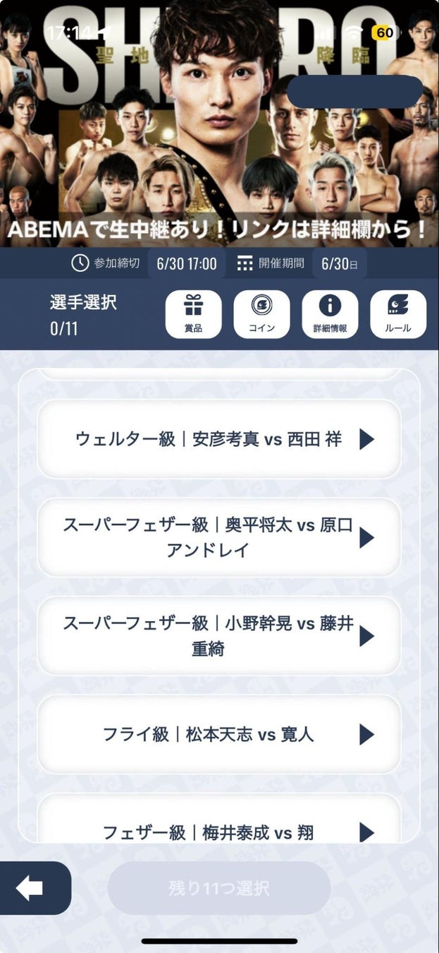 予想内容は、各対戦カードの勝敗だけでなく、「KO・TKO勝ち」「判定勝ち」など勝敗の決まり方も予想できます。