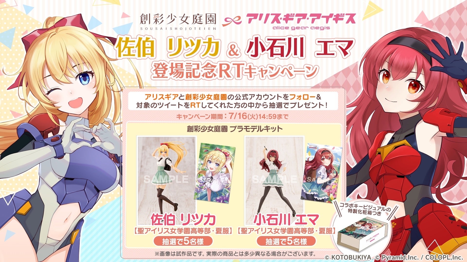 『アリス・ギア・アイギス』に、コトブキヤのプラモデルシリーズ『創彩少女庭園』から「佐伯 リツカ」と「小石川 エマ」がプレイアブルキャラクターとして登場しました。