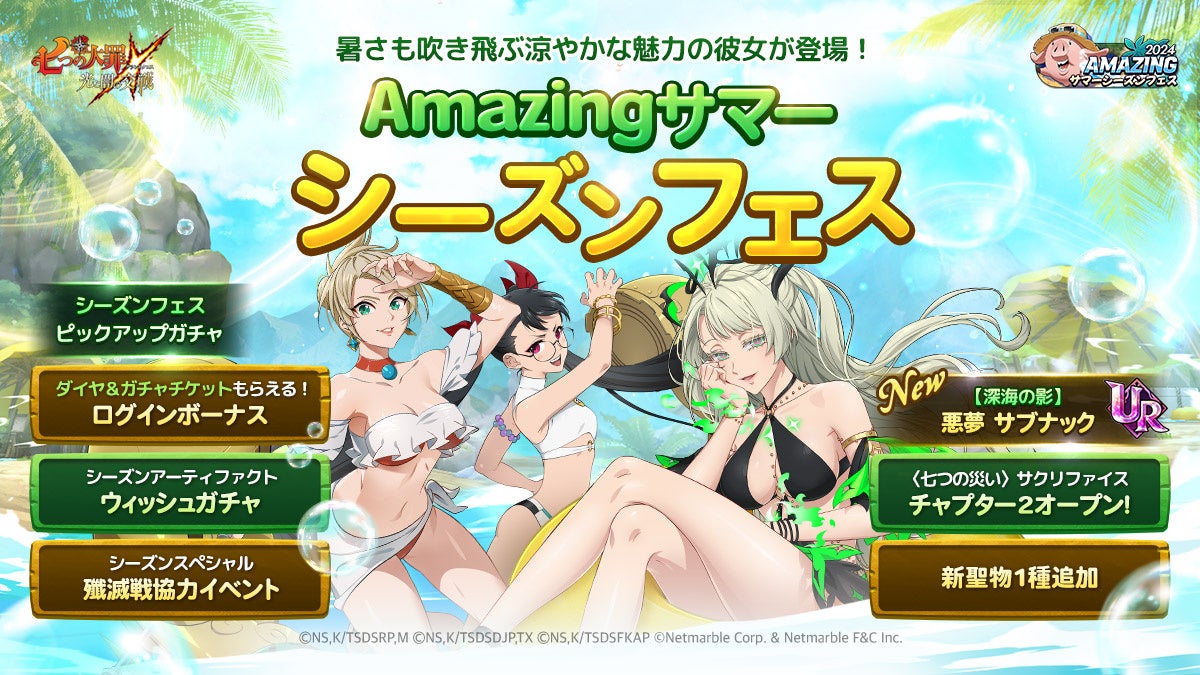 『七つの大罪 ~光と闇の交戦~』【2024 Amazing サマーシーズンフェス】が開催されます!新キャラ【深海の影】悪夢 サブナックが登場し、フェス限定キャラやシーズナル限定キャラなどが復刻登場します。